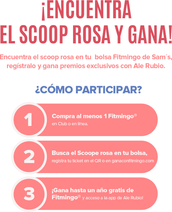 Recuerda que para ser un participante valido, debes registrar la foto de tu ticket completo y totalmente legible así como la foto de tu scoop rosa contenido en las bolsas de Fitmingo® vendidas en Sams Club®.